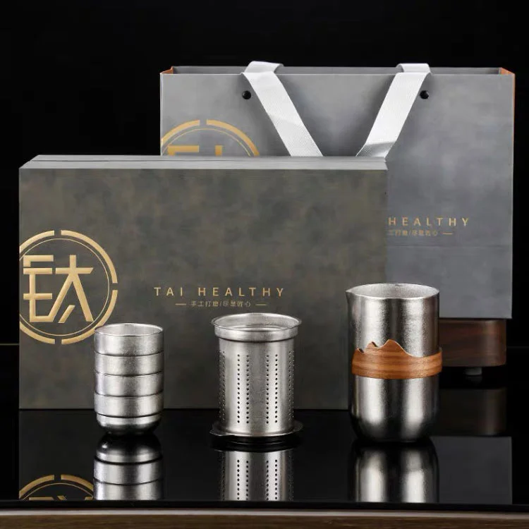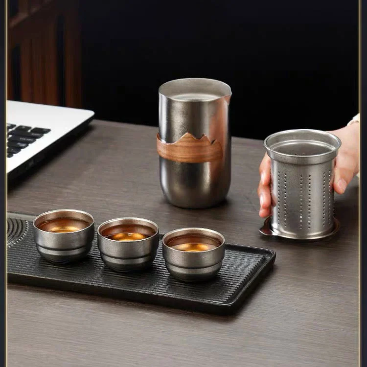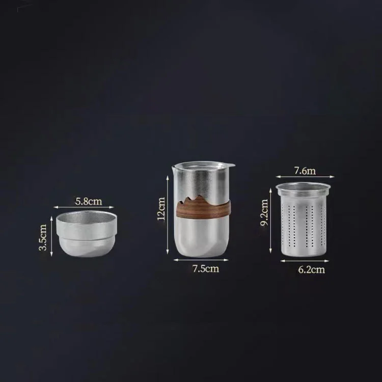 To je čaj za zunanje, narejen je iz titana in embalaže z darilnimi škatlami. Štiri majhne skodelice iz titana, ena velika skodelica Titaniunm in ena usnja. Štiri majhne skodelice je mogoče enostavno postaviti v veliko skodelico, nato pa lahko veliko skodelico damo v torbico. En žep je dovolj za držanje vseh orodij. Naj uživate na močnem alkoholu na prostem s prijatelji na sproščeno.